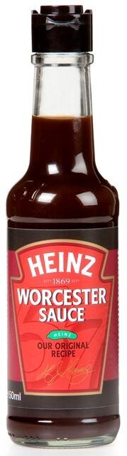 Ingredients : Spirit vinegar, molasses, malt vinegar (from Barley), water, sugar, tamarind, salt, anchovies (fish), onions, garlic, spice, flavourings