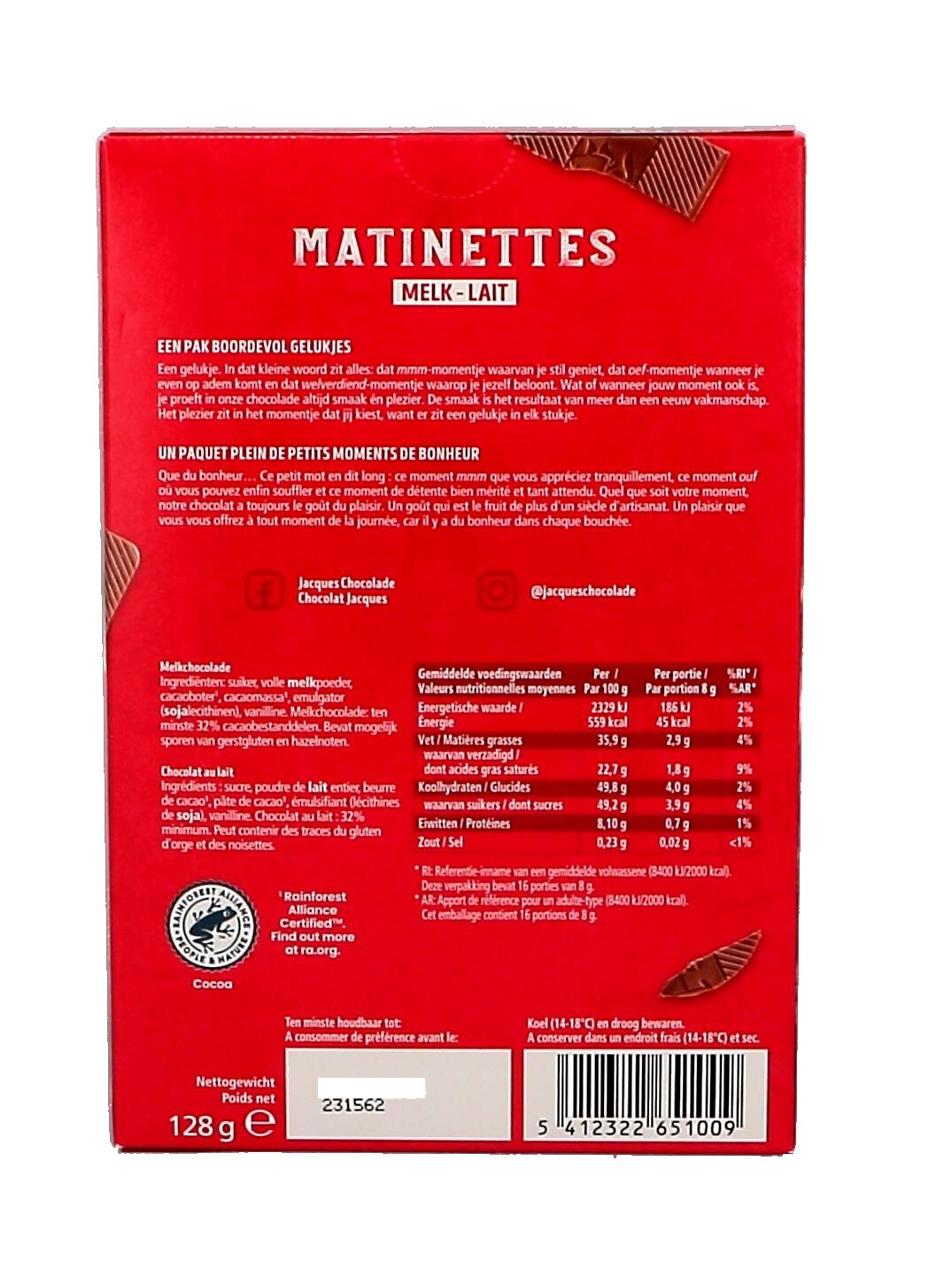 Matinettes zijn gemaakt van 100% Belgische melk chocolade .