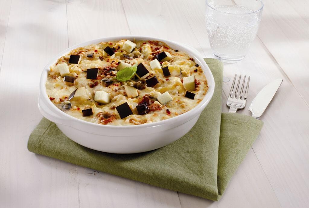 Mediterraanse ovenschotel van aardappelschijfjes, gehakt, aubergines en tomaat met een bechamelsaus en zuiderse specerijen.