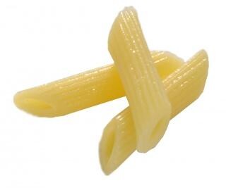 Pâtes forme tube avec surface rayée, coupées en talus, précuites, légèrement huilées et salées, surgelées individuellement et qui ne collent pas.