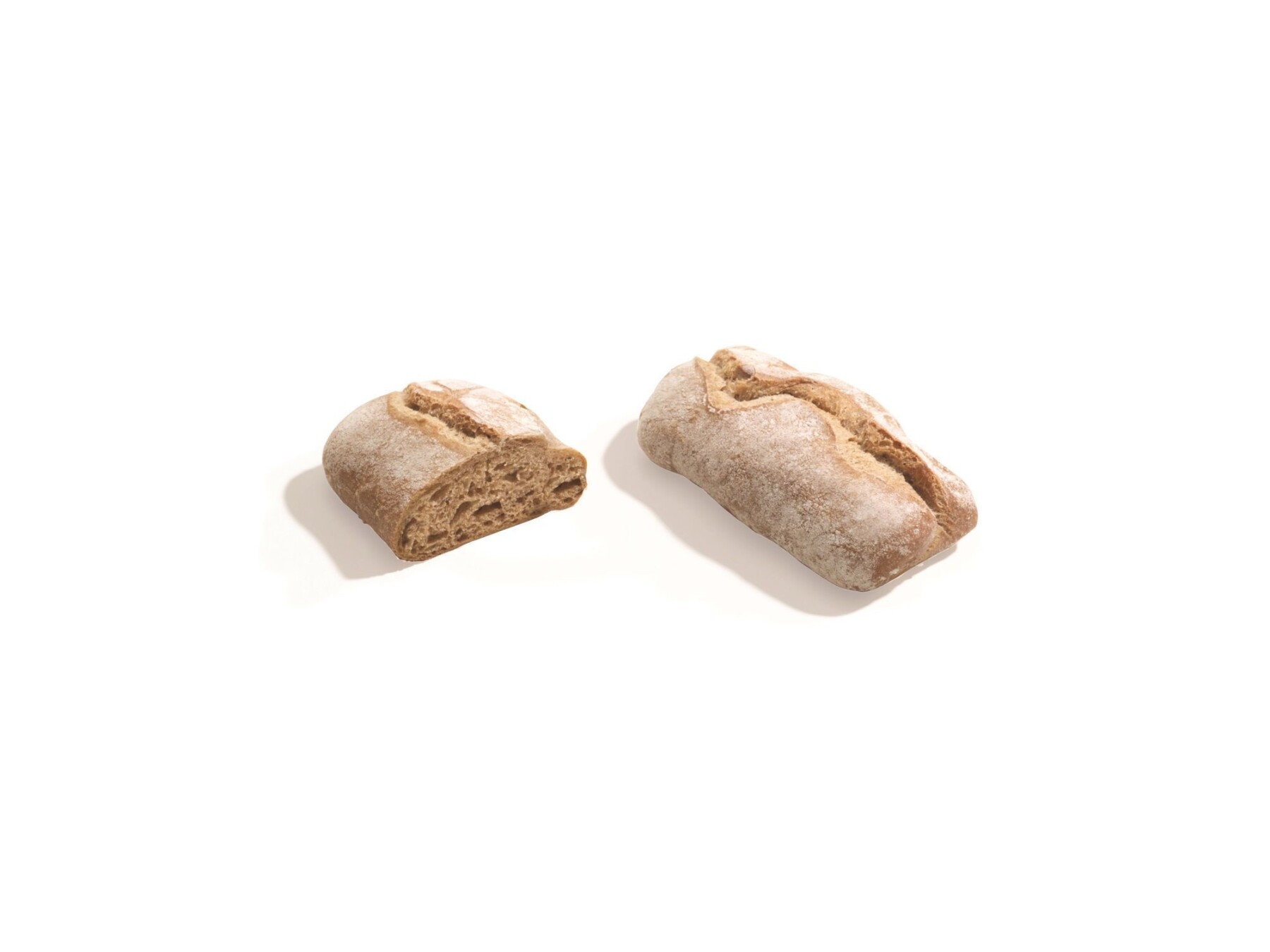 Artisanaal donker mini broodje van tarwe en gemoute gerst, handgevouwen, met bloem bestrooid en op steen gebakken.