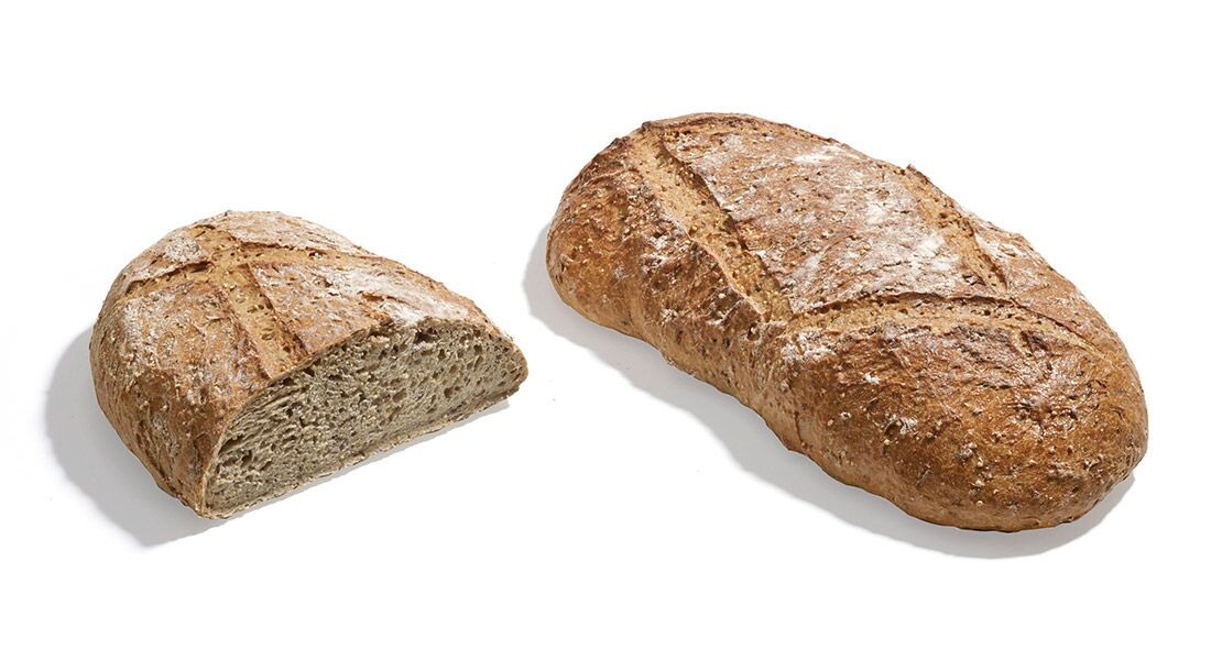 Pain multicéréales français traditionnel au blé (malté), au levain, au seigle et à la farine d'orge torréfié et malté, enrichi de graines de lin noir et de millet, cuit sur pierre.