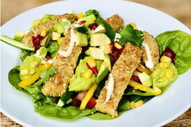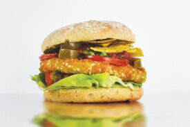 Un burger unique d'avocat en dés et de grains de maïs croquants dans une couche de panure croustillante de multigrains et de quinoa.