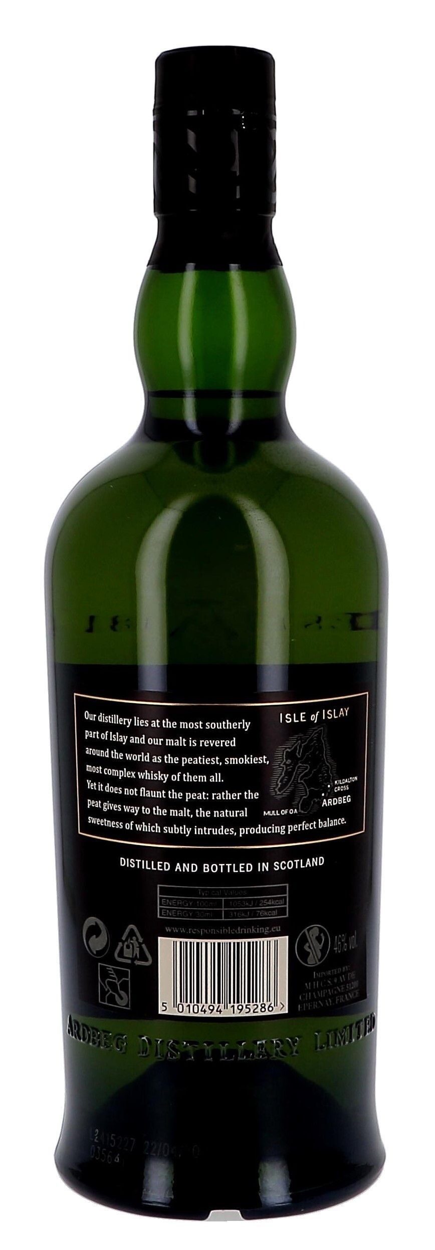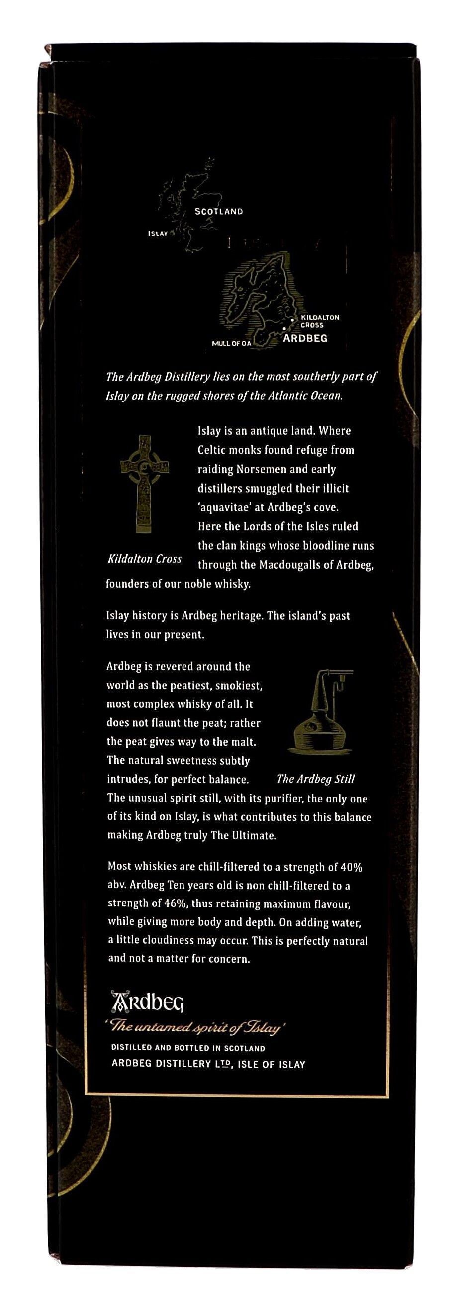 De distilleerderij Ardbeg ligt aan de zuidkust van Islay, ten zuid westen van Schotland. Al de prachtige delicate jodiumhoudende aroma's van het eiland zijn in deze heerlijke maltwhisky vertegenwoordigd. Om alle bestaande en authentieke geuren te behouden heeft men bij Ardbeg besloten om de whisky niet koud te filteren, wat een prima idee was. De rijke aroma's, de rokerigheid en het turf, smelten in deze whisky tot een absolute rijkdom van smaak samen.