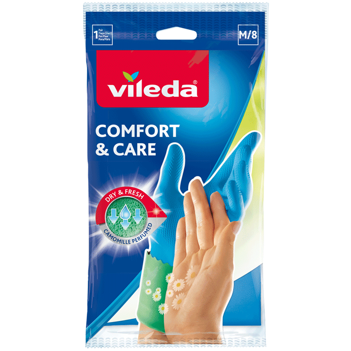 Met de innovatieve Vileda Comfort & Care handschoenen voor de gevoelige huid kunt u uw dagelijkse schoonmaak veilig, snel en comfortabel uitvoeren. Deze handige en herbruikbare latex handschoenen zijn perfect voor taken zoals de vaat of het schoonmaken van de keuken. Als extraatje hebben deze handschoenen een geïntegreerde kamillegeur en vochtinbrengende crème. De absorberende binnenvoering voorkomt zweethanden.