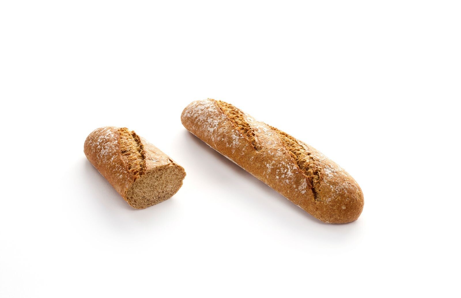 Rustieke half baguette van tarwe-, volkoren tarween een beetje roggebloem verrijkt met moutbloem en een beetje gedroogde desem voor een intense, geroosterde smaak. Met bloem bestrooid.