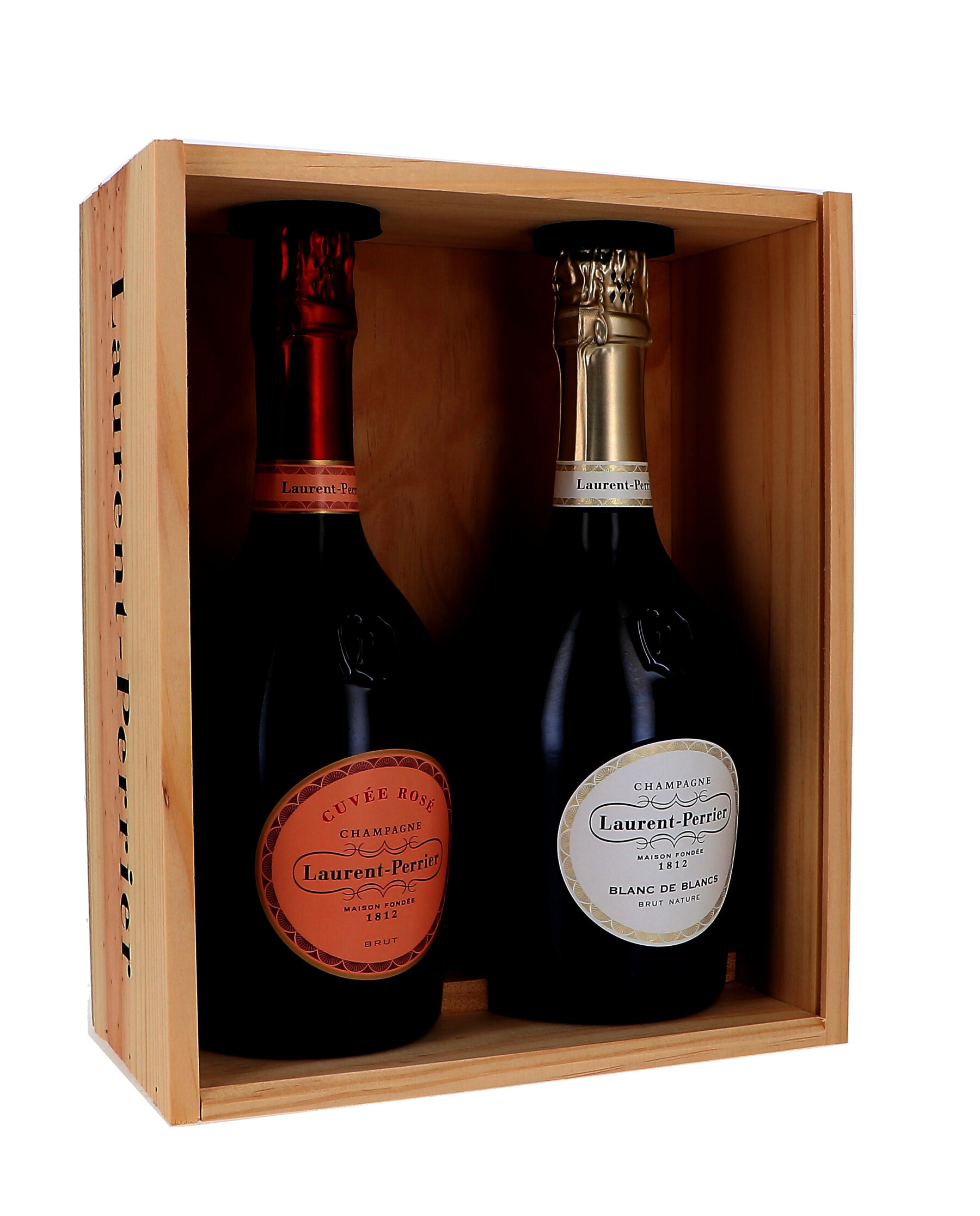Prachtige geschenkverpakking met 1 fles Laurent Perrier Cuvée Rosé + 1 fles Laurent Perrier Blancs de Blancs Brut Nature in houten kist met schuifdeksel