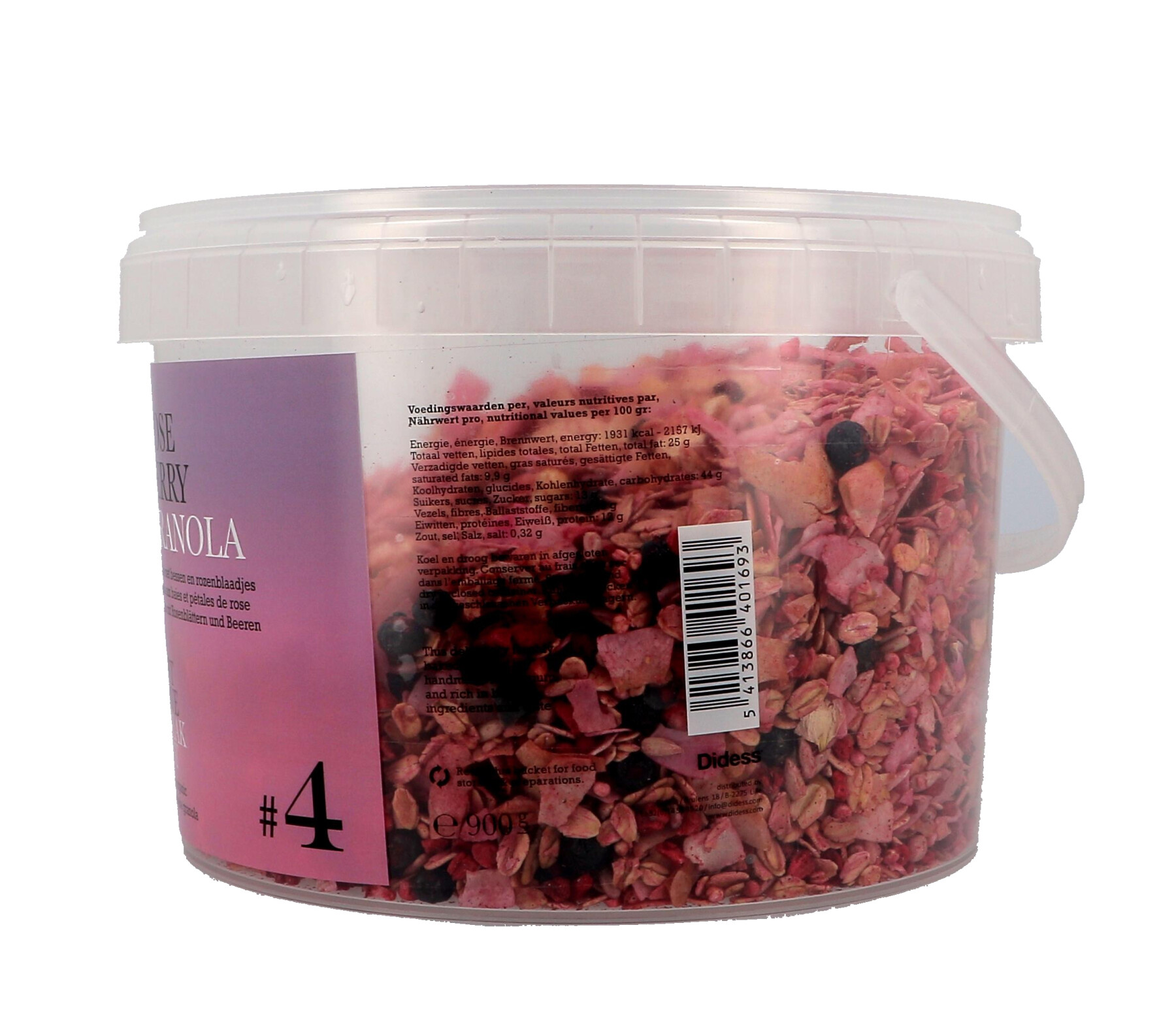 Deze frisse en vrolijk makende granola combineert fruitige blauwe bessen en frambozen met delicate rozenblaadjes voor een elegante, florale toets. Schud een portie in je ontbijtkom en laat je verrassen door de prachtige roze-paarse kleur die de bessen aan je yoghurt geven. (van biologische oorsprong BE-BIO-01)