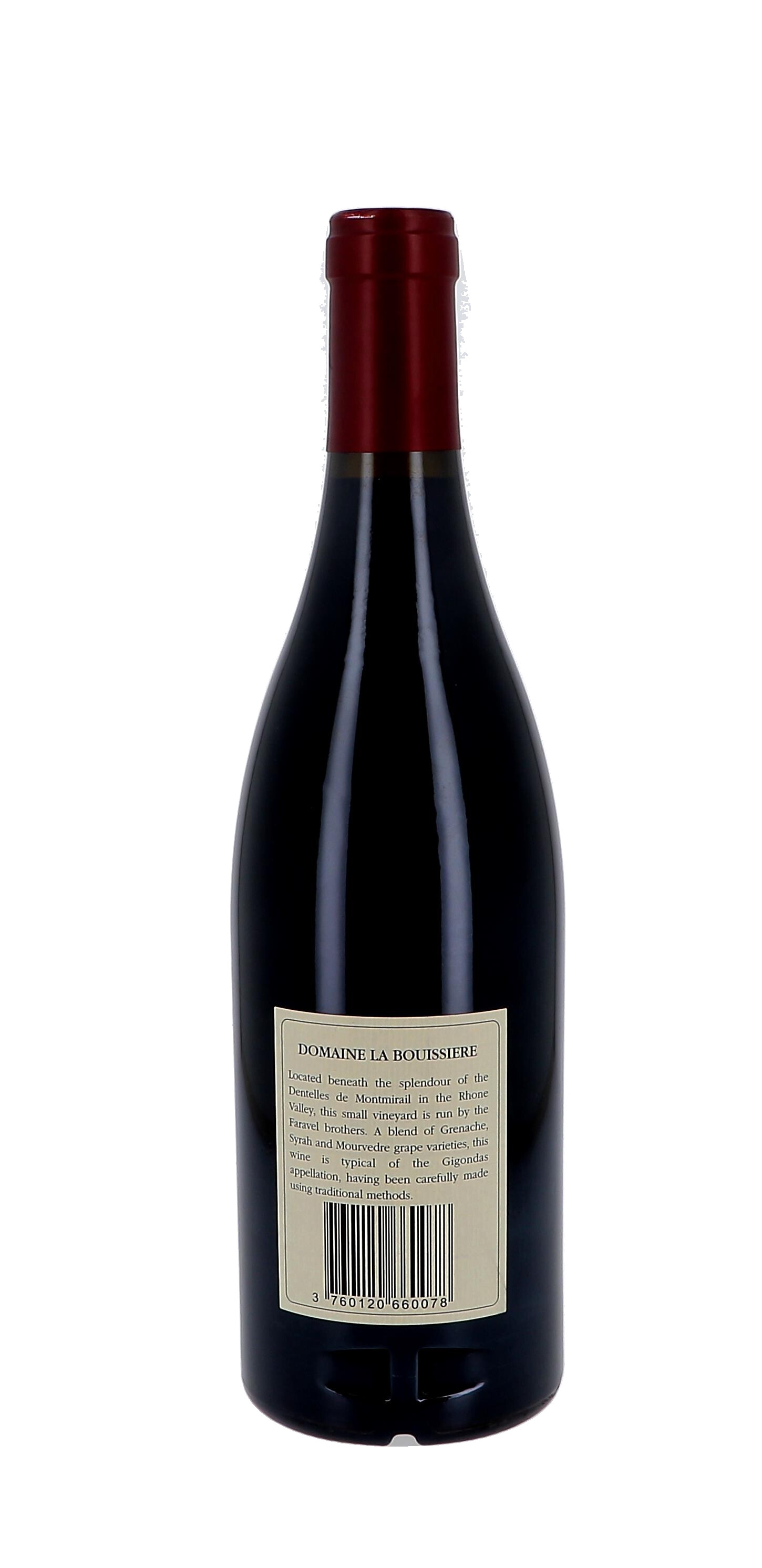 Jazzfanaat Thierry 'Mingus' Faravel bezit een aparte wijngaard . Hoog verscholen tussen de Dentelles de Montmirail verschilt deze wijngaard in zowat alles met bv de Garrigues wijngaarden die de rest van de Gigondas typeert.Vanwege het grote hoogteverschil met de andere , is Thierry haast steeds de laatste om zijn druiven binnen te halen. De invloed van de vroeg rijpende Syrah is ook iets belangrijker bij Bouissiere dan bij de meeste andere . Dit vertaalt zich in wijnen met een andere textuur dan gebruikelijk : meer natuurlijke frisheid,minder overrijp fruit,meer krokanterieen. Geconcentreerde kersenrode kleur met rijkelijke tranen. Pittig rood en zwart fruit met een fijne kruidigheid sieren de geur. De aanzet is mooi maar de middensmaak die volgt is nog zoveel meer; rijk, vlezig terwijl de geurindrukken bevestigd worden met vooral klein rood en zwart fuit (ook veel cassis) alsook het onvermijdelijk kruidig aksentje van de echte Rhônewijn. Krachtige, fruitrijke, kruidige (peper) afdronk die niet alcoholrijk overkomt doch zowaar fris.