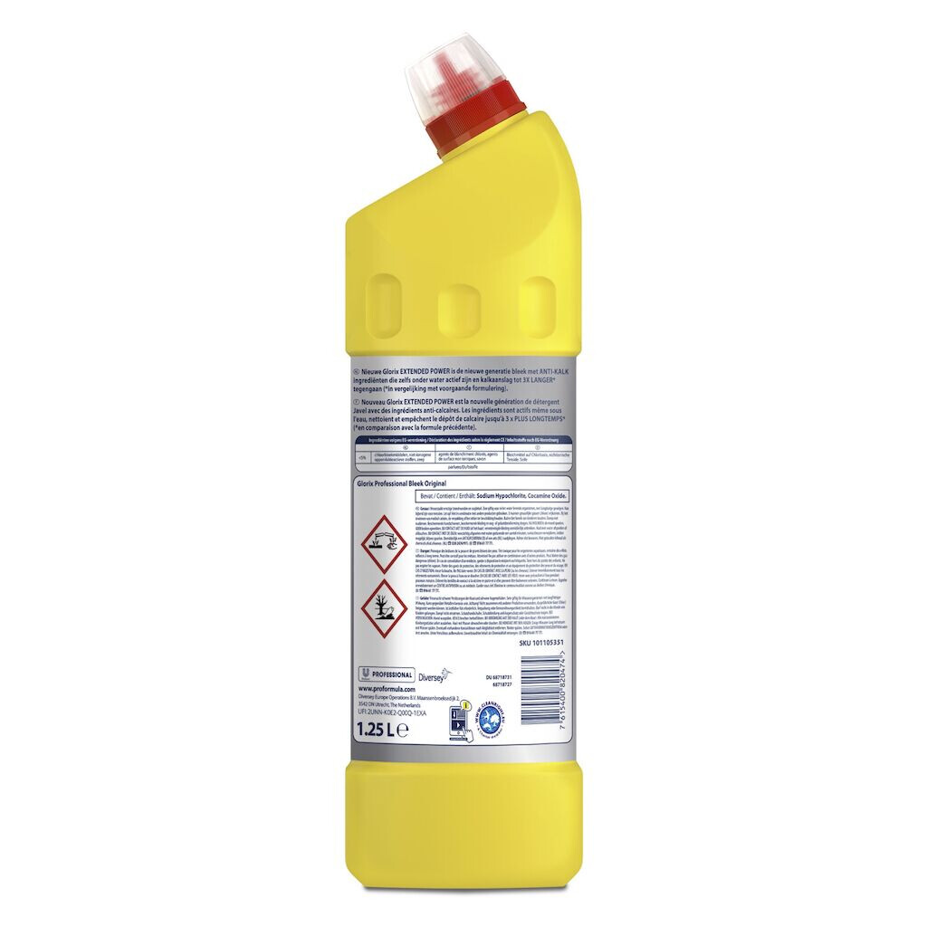 Glorix Pro Formula Original Bleekmiddel is ontwikkeld voor het hygiënisch reinigen van toiletpotten, urinoirs en gootstenen, maar kan ook gebruikt worden voor het reinigen van vloeren en andere werkoppervlakken. Dankzij de dikke formule hecht Glorix Pro Formula Bleekmiddel beter aan verticale oppervlakken en gaat het langer mee.De unieke formule helpt kalkaanslag te voorkomen. Glorix Pro Formula Dik Bleekmiddel is veilig voor de septische put. De aanwezigheid van chloor zorgt voor een effectieve bleekwerking en garandeert een optimale hygiëne.