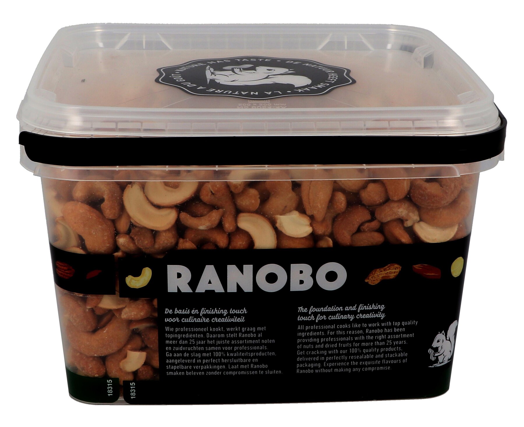 De cashewnoot is een bijzonder voedzame en smakelijke noot. Deze noot is oorspronkelijk afkomstig uit Zuid-Amerika maar wordt nu vrijwel in alle tropische streken gekweekt. De cashewnoten die Ranobo verwerkt zijn meestal afkomstig uit Vietnam of India. Deze zijn iets groter dan de doorsnee cashewnoot. Dankzij hun knapperige structuur en zachte smaak zijn ze de laatste jaren aan een grote opmars bezig. Ranobo cashews zout worden goudbruin gebrand in arachideolie en nadien licht op smaak gebracht met zout. De cashewnoten kunnen gebruikt worden als stijlvol aperitief en als tussendoortje.