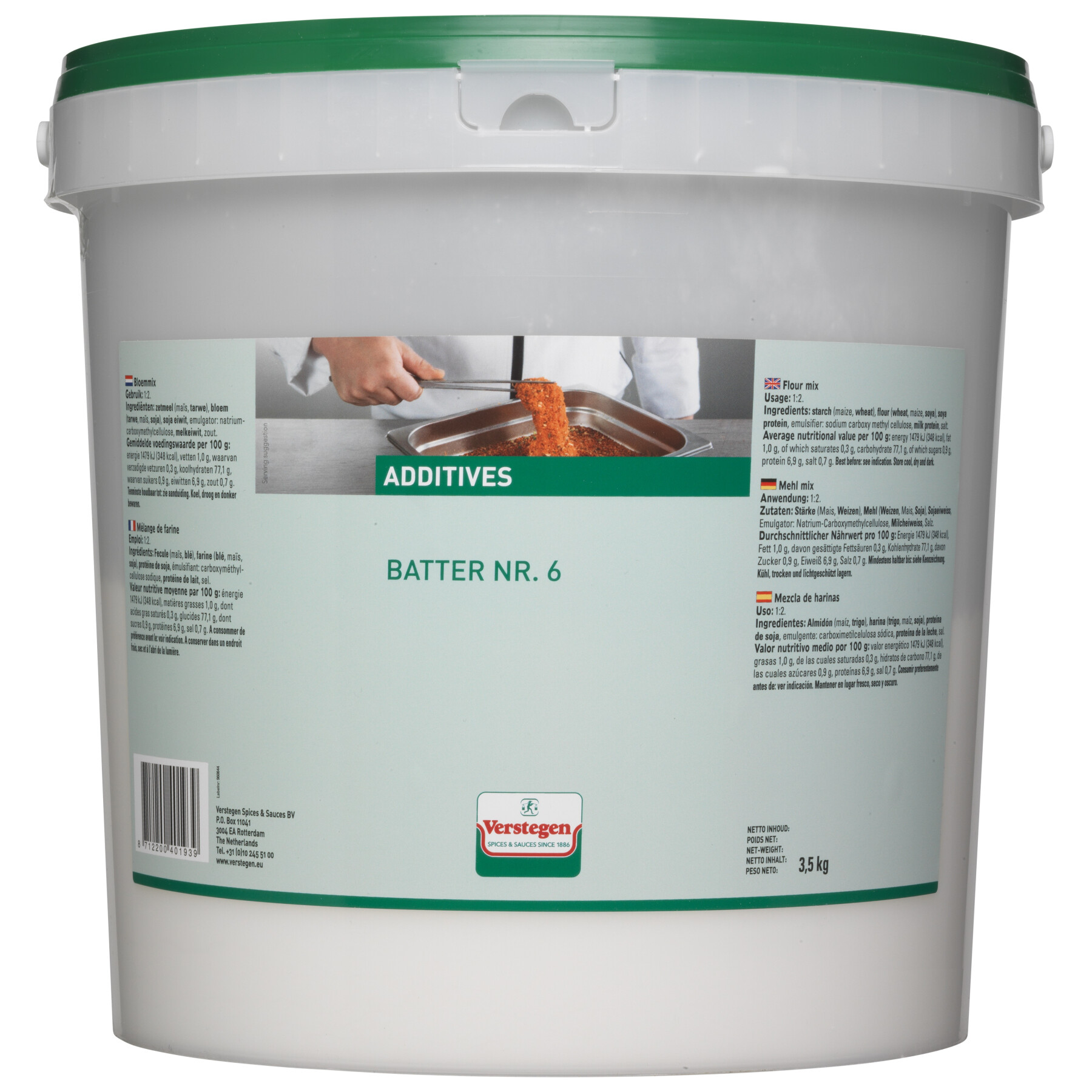 Batter N°6 is een paneermix of coatingmix van Verstegen, bedoeld voor het krokant afwerken van vlees, vis of gevogelte.Inhoud : 3kg